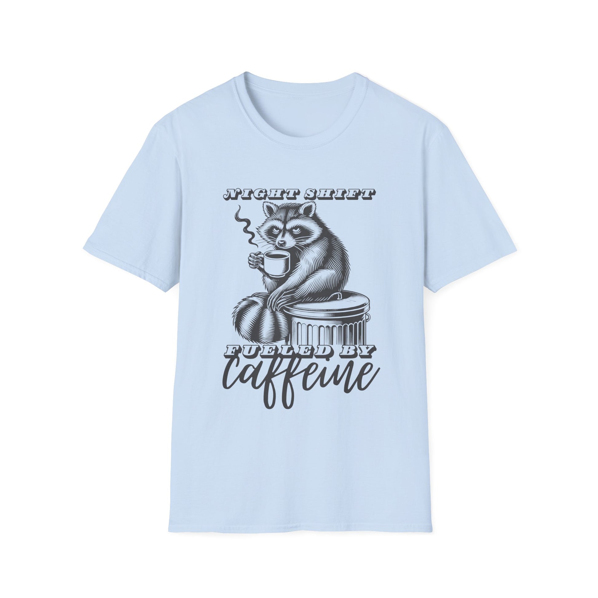 Night Shift T-Shirt – Fueled by Caffeine Raccoon Funny Coffee Lover Tee